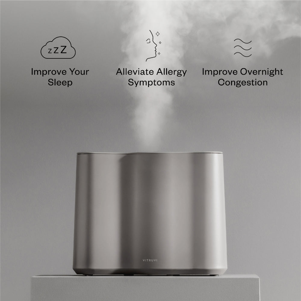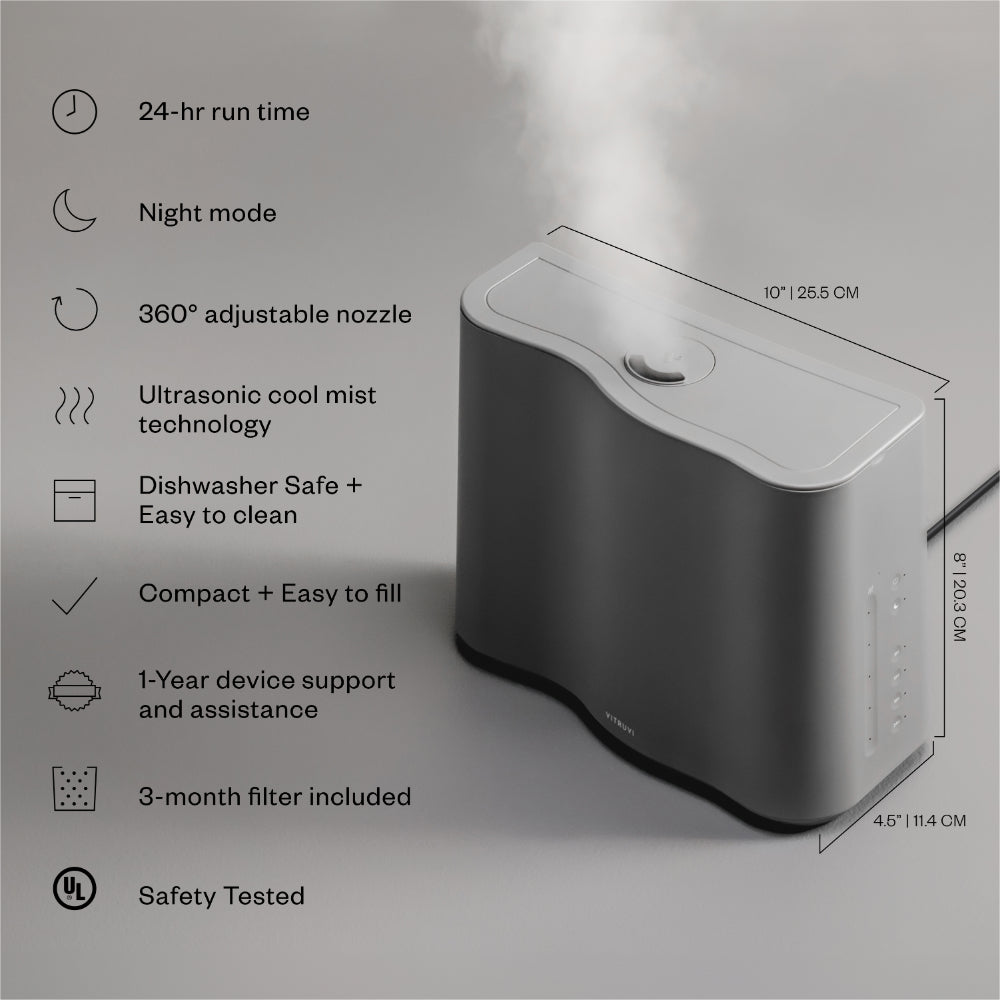 Elevate your sleep and beauty routine with the Cloud Humidifier. Whisper-quiet and designed for optimal performance, it provides a continuous cool mist that hydrates your skin and hair, promoting a dewy complexion and silky locks. With settings ranging from 8 to 24 hours and a light-free night mode, it ensures undisturbed, restful sleep. Safe for kids and easy to clean with a dishwasher-safe water bucket, the Cloud Humidifier is the perfect addition to your bedroom for enhanced wellness and natural immunity. Its compact, nightstand-friendly design fits seamlessly into any space, humidifying rooms up to 600 sq.-ft.