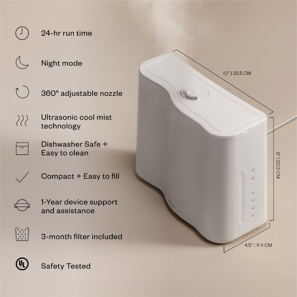 - Humidifier type: Ultrasonic; 8-hour, 12-hour, 16-hour, and 24-hour settings.