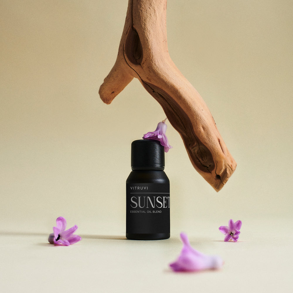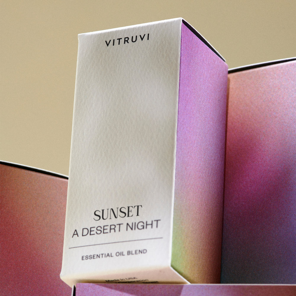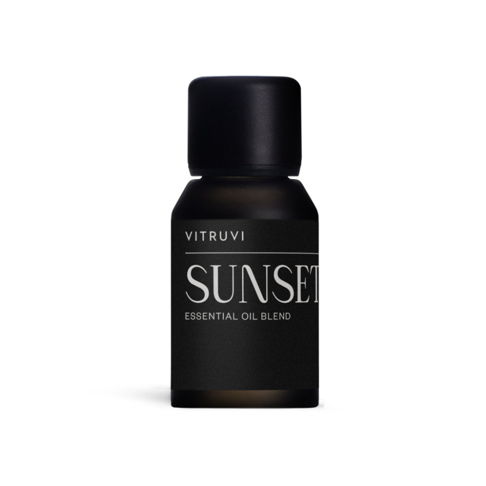 Sunset is a herbal, warm blend with top notes of Ho Wood and Frankincense and grounding bottom notes of Eucalyptus and Lavender. It smells like dry spices and desert sunsets, under the Palm Springs stars. This blend is Ideal for creating a warm and inviting atmosphere and relaxing after a long day.